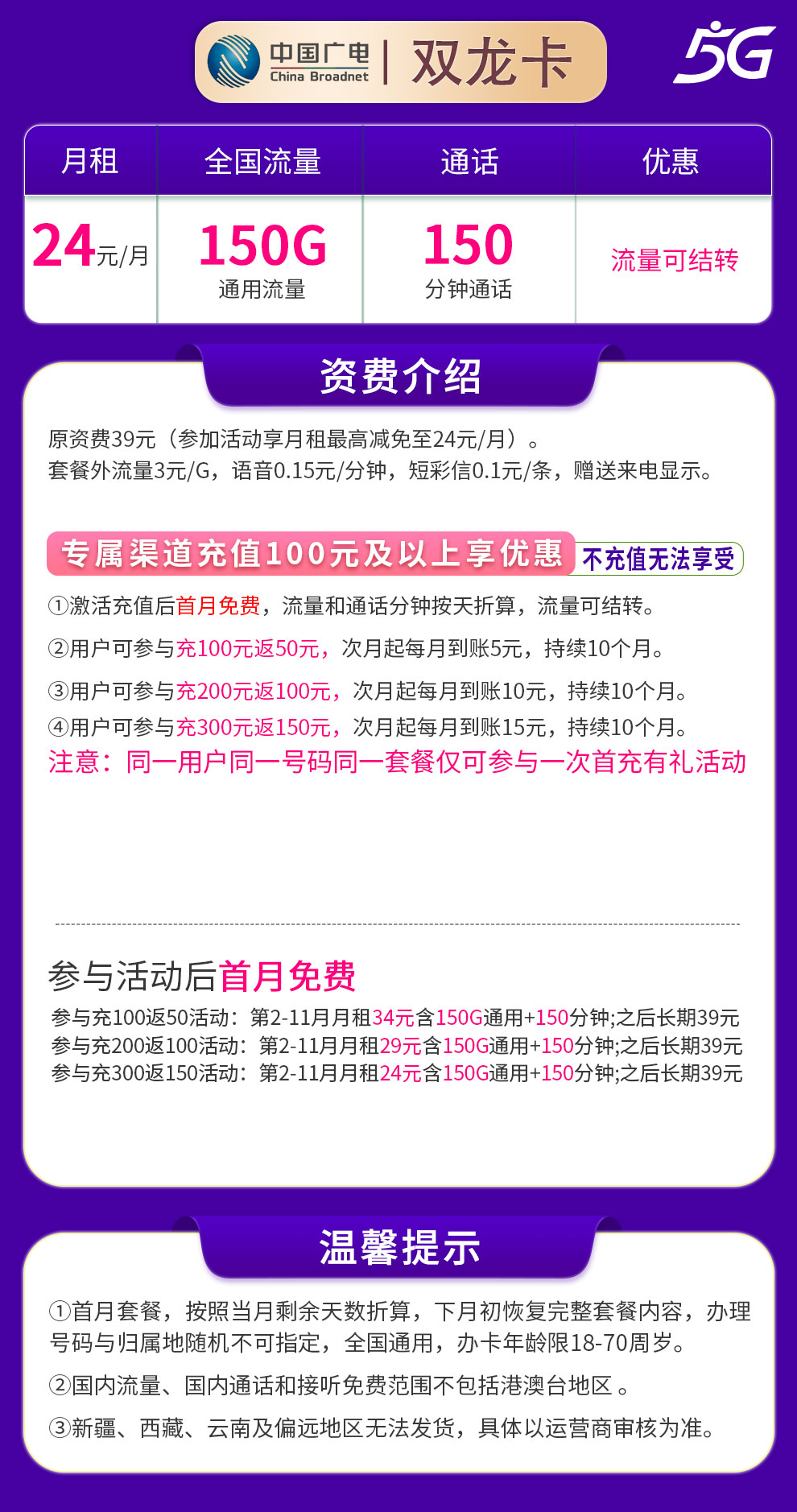 G2广电双龙卡24元150G通用+150分钟通话【发全国】