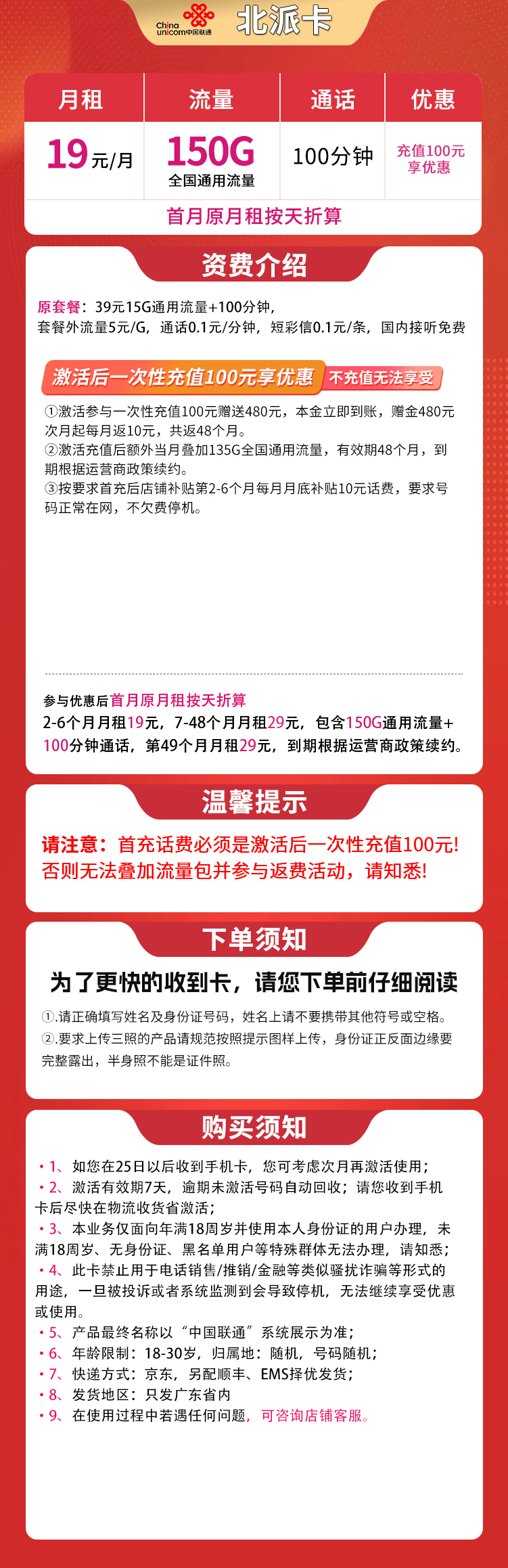 2-6个月月租19元第7-48月月租29包含150G通用流量+100分钟通话,第49个月月租29元,到期根据运营商政策续约。