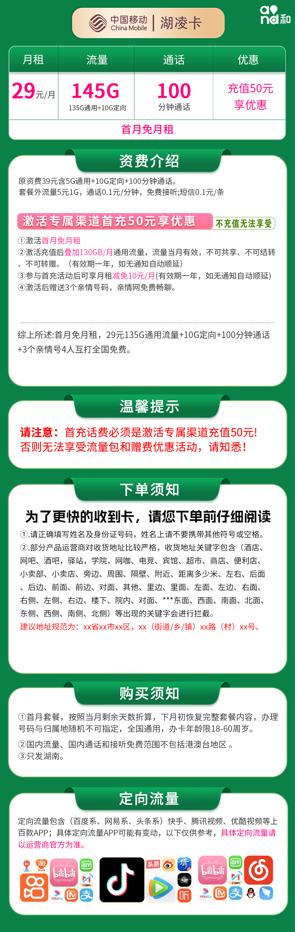 N移动湖凌卡29元145G+100分钟【只发湖南】