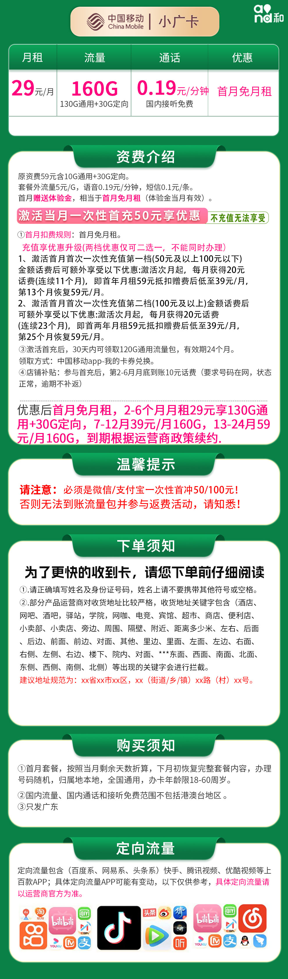 - 激活时一次性充值100元:第2-6个月29元/月,第7-24个月39元/月