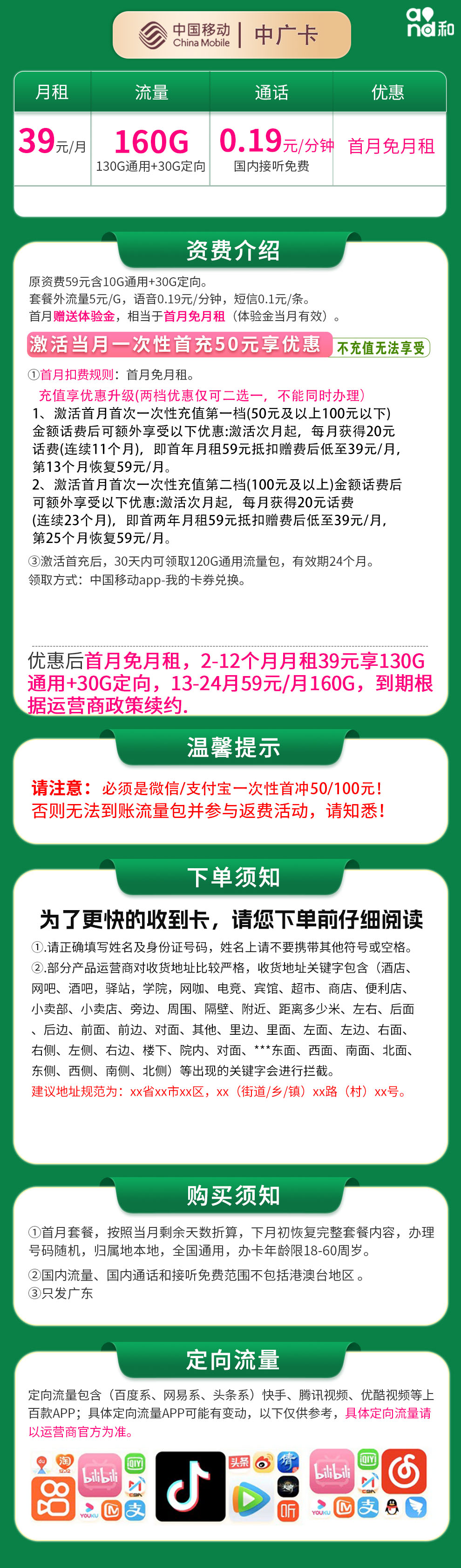 - 充50元:第2-12个月每月39元,享130G通用+30G定向流量