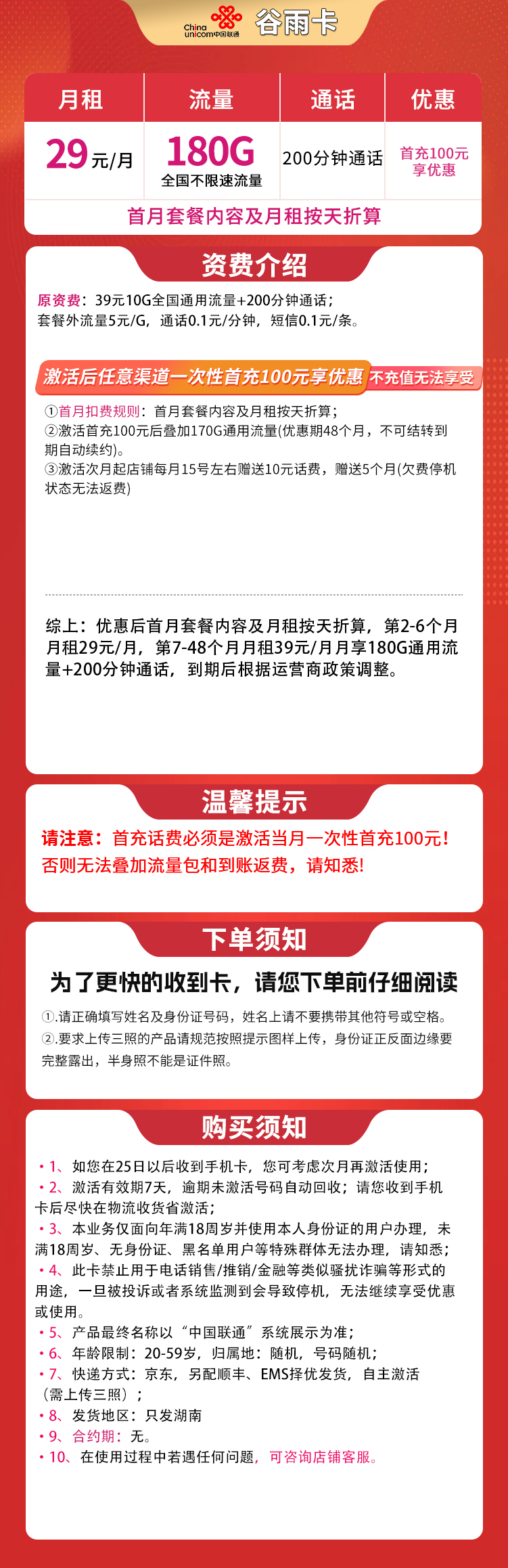 N联通谷雨卡29元180G+200分钟【只发湖南】