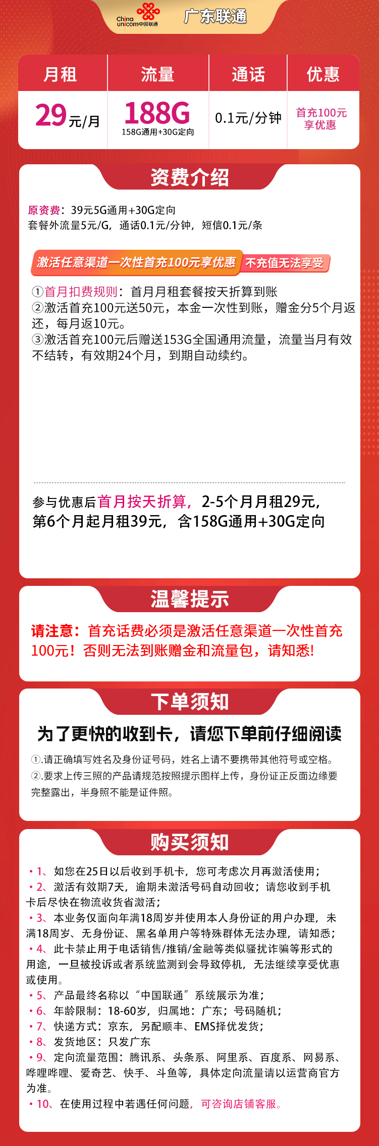- 广东联通29元套餐:首月39元按天折算,激活后需一次性充值100元,次月起每月返10元(共返50元)。2-6月实付29元/月,之后恢复39元/月。充值后48小时内赠送153GB流量(50GB全国通用+103GB全国通用),有效期24个月自动续订。