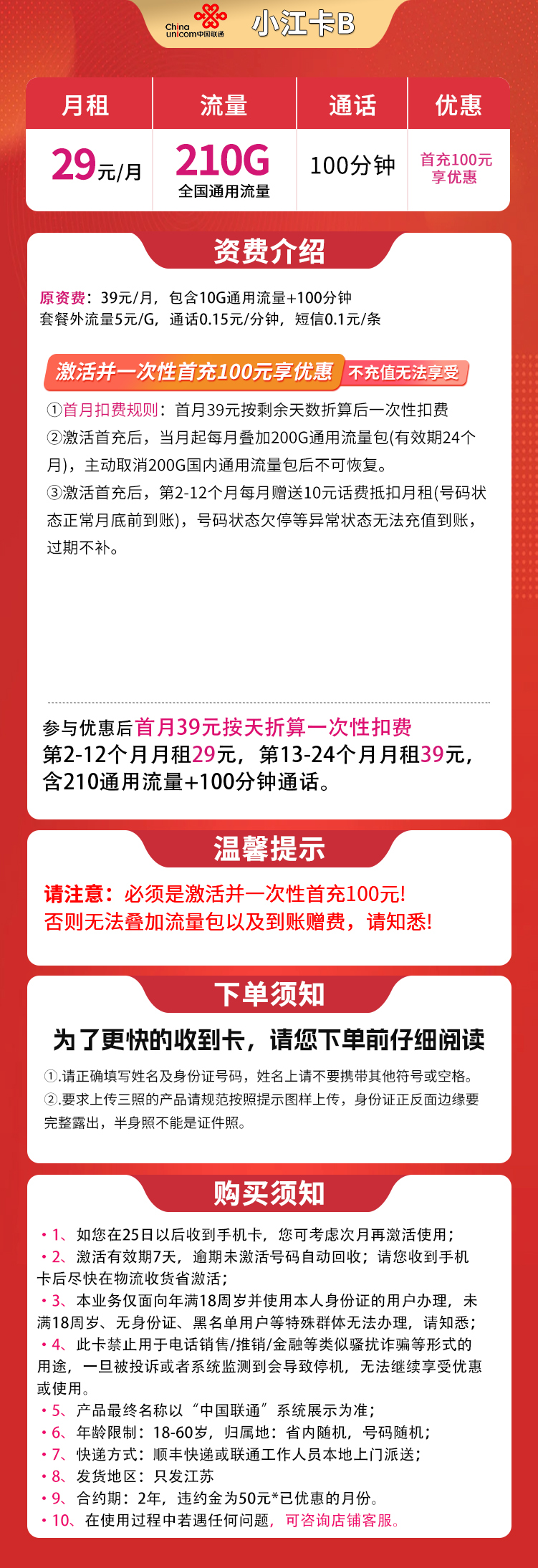 - 第2-12个月:每月29元=210G通用流量+100分钟通话