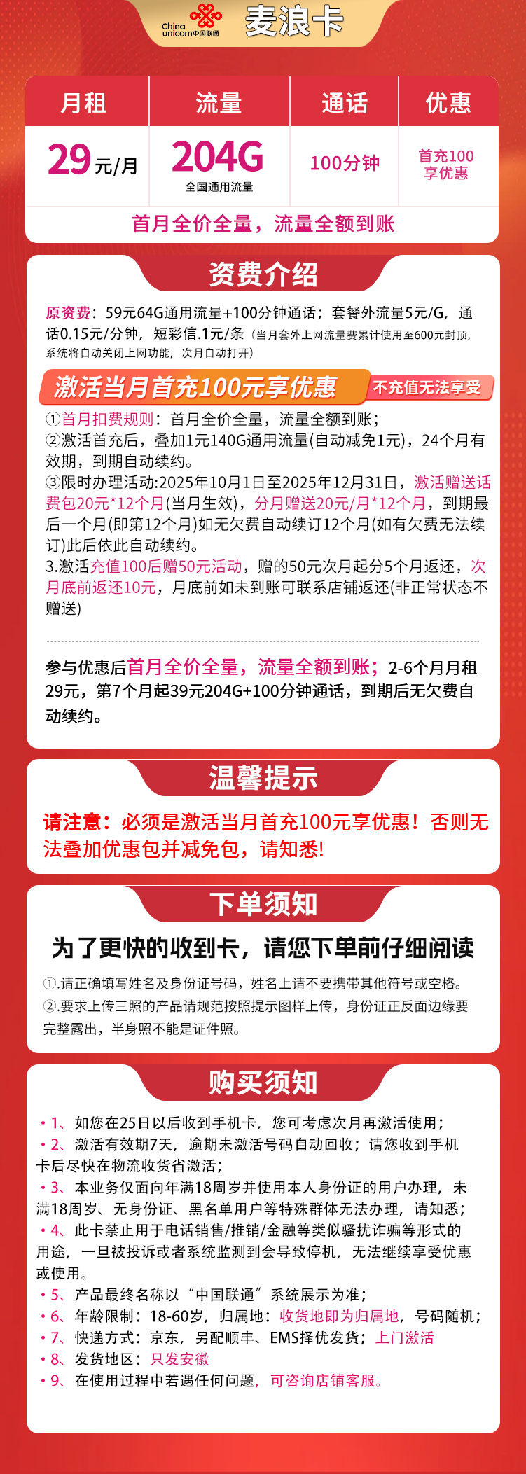 联通麦浪卡29元204G+100分钟【只发安徽】