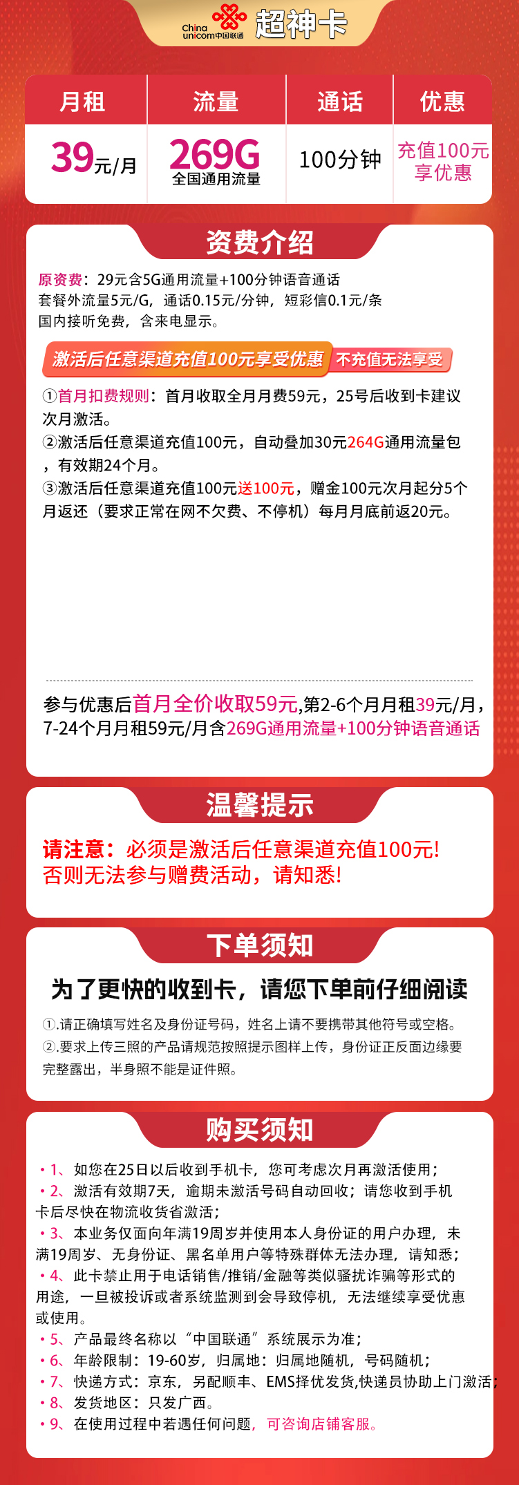 G联通超神卡39元269G通用+100分钟【只发广西】