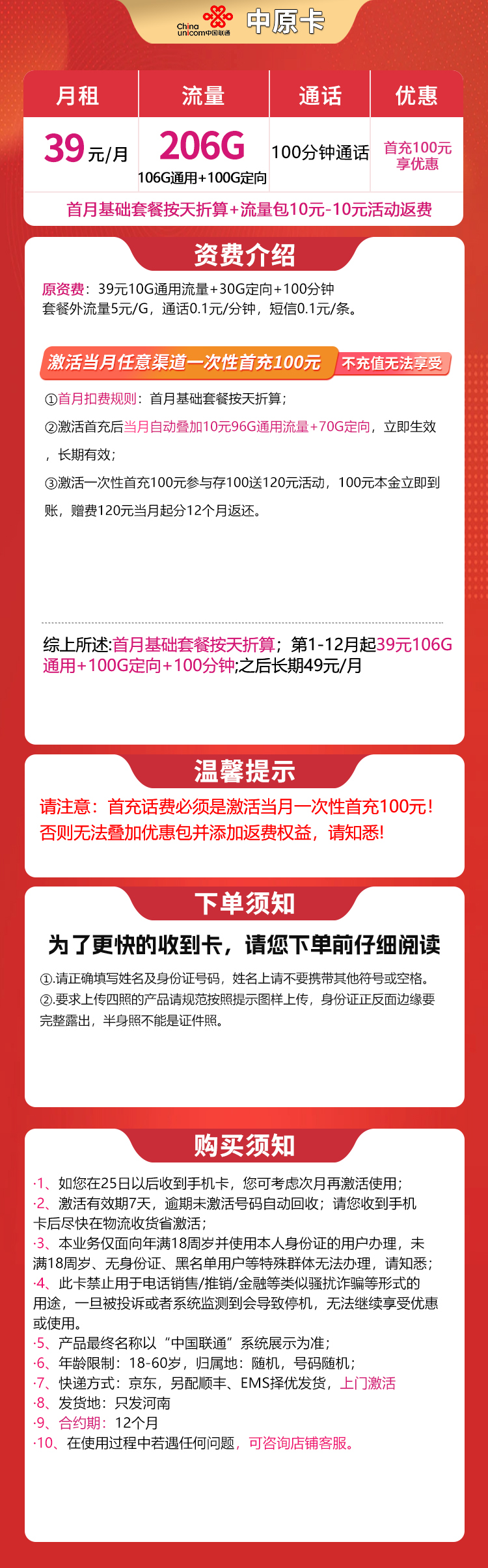 - 第1-12个月:每月39元得206G流量(106G通用+100G定向)+100分钟通话