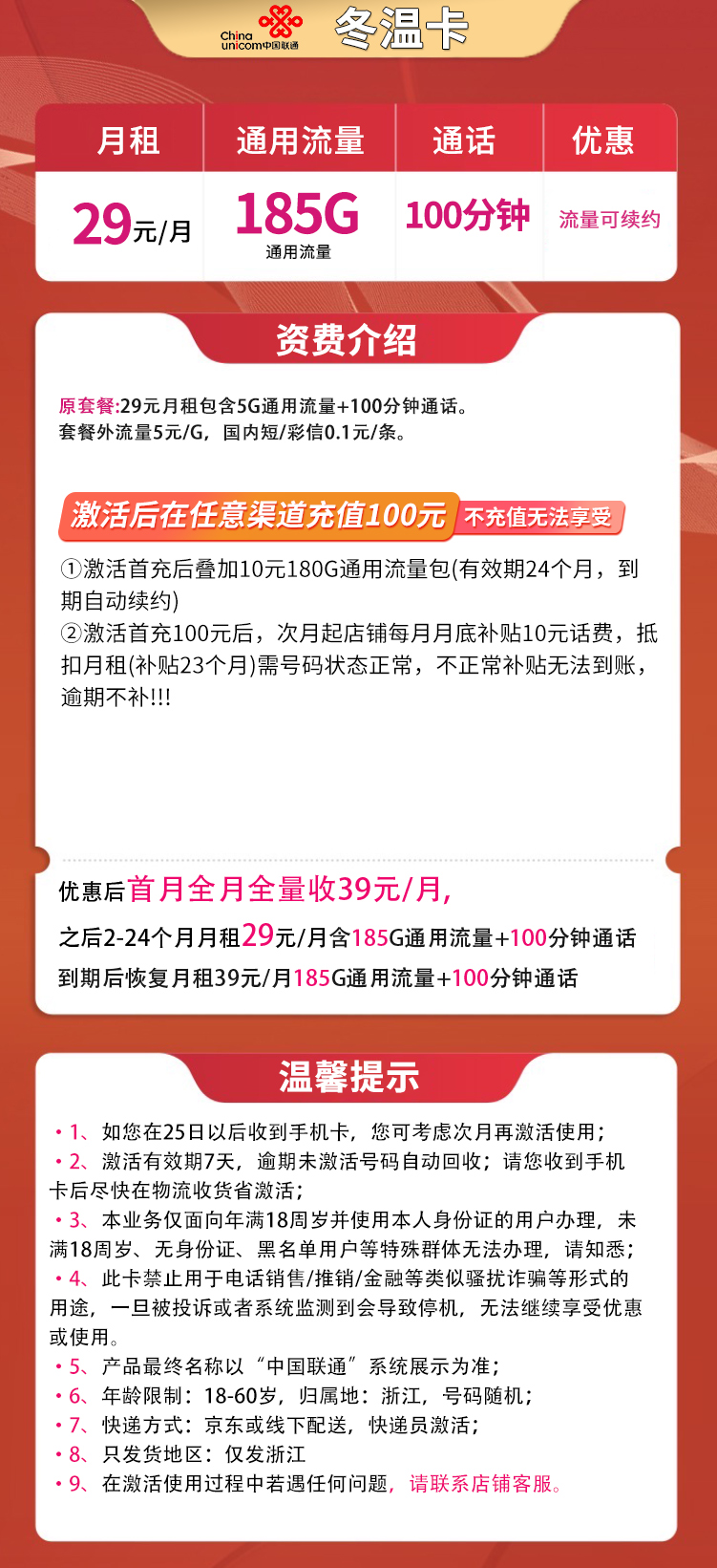 - 【联通冬温卡】29元月租=185G通用流量+100分钟通话