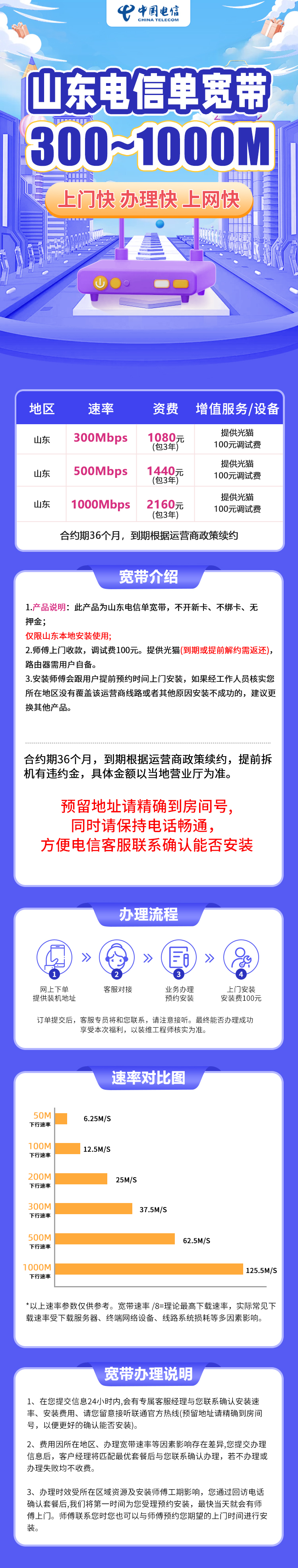 1.产品说明:此产品为山东全省电信单宽带,不开新卡、不绑卡、无押金;仅限山东本地安装使用