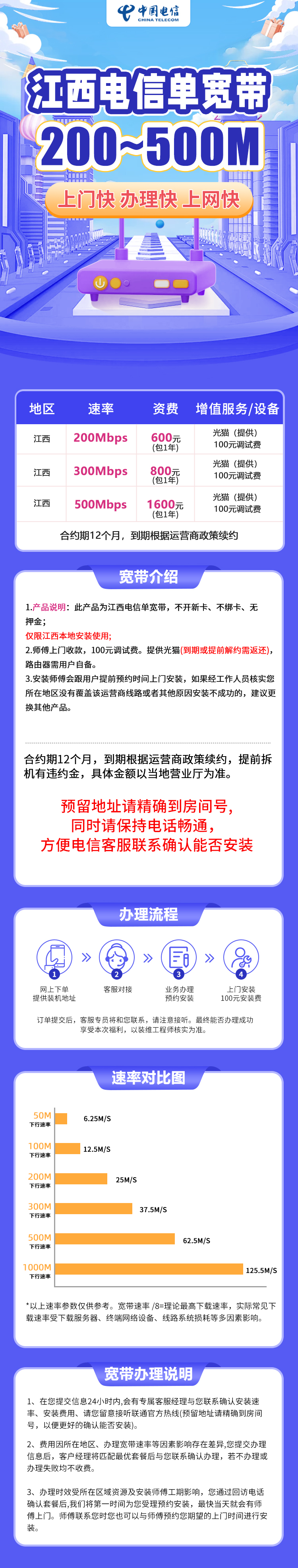 1.产品说明:此产品为江西全省电信单宽带,不开新卡、不绑卡、无押金;仅限江西本地安装使用