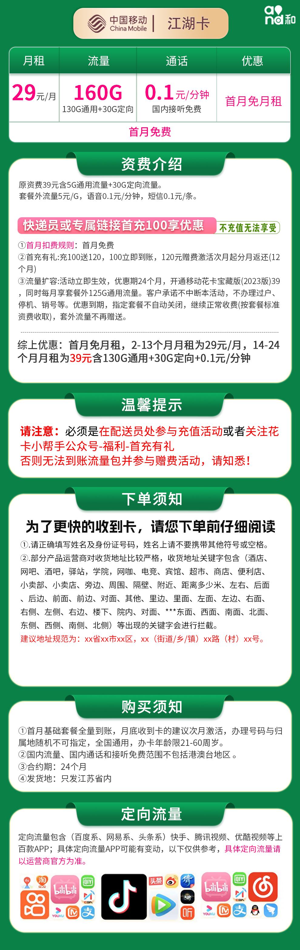 - 每月29元,前12个月每月160G流量(130G通用+30G定向),第13-24个月每月39元160G流量。首月免费,充100送120(100立即到账,120分12个月返还)。需承诺24个月内不换套餐、不过户、不停机。仅限江苏用户办理。