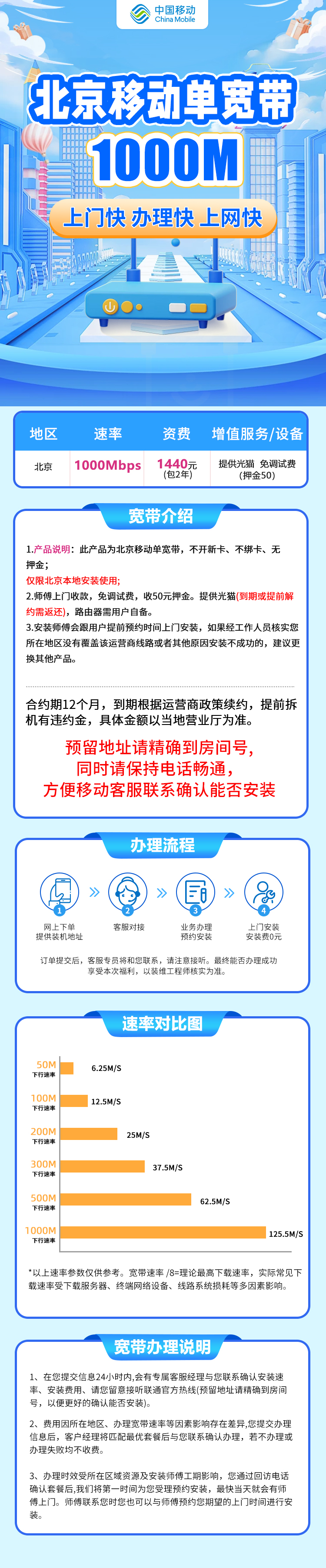 1.产品说明:此产品为北京市移动单宽带,不开新卡、不绑卡、无押金;仅限北京本地安装使用