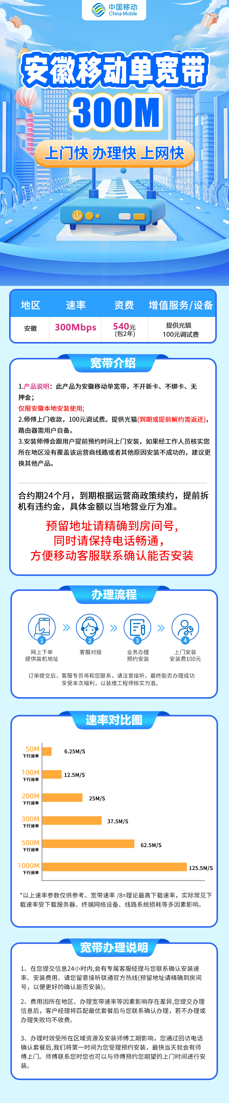 1.产品说明:此产品为安徽全省移动单宽带,不开新卡、不绑卡、无押金;仅限安徽本地安装使用