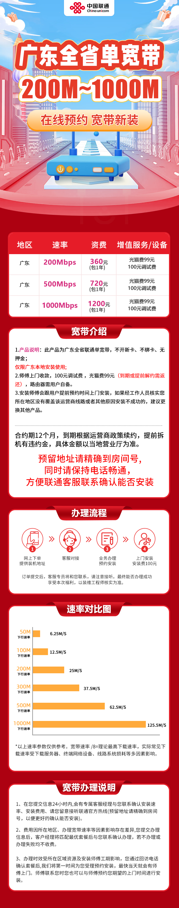 1.产品说明:此产品为广东全省联通单宽带,不开新卡、不绑卡、无押金;仅限广东本地安装使用2.师傅上门收款,调试费:100元。光猫费用99元,路由器需用户自备。