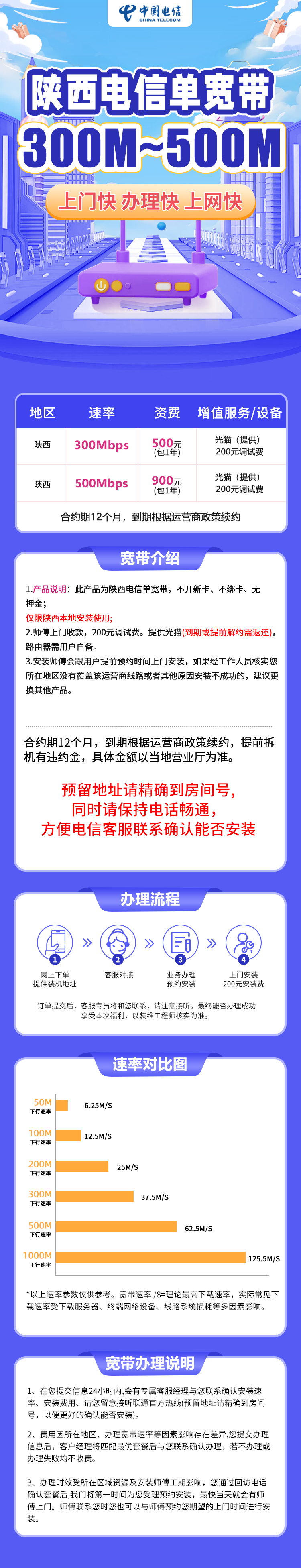 1.产品说明:此产品为陕西全省电信单宽带,不开新卡、不绑卡、无押金;仅限陕西本地安装使用