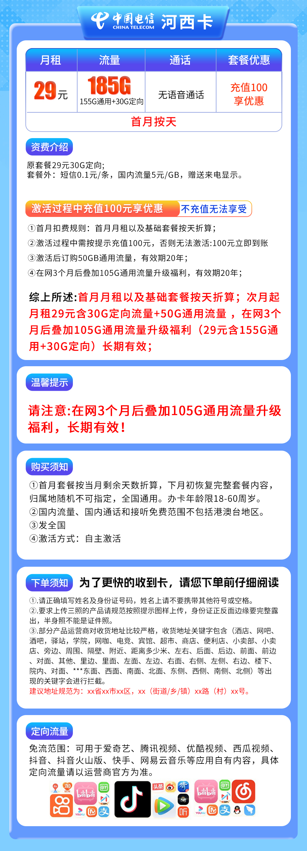 次月起月租29元含30G定向流量+50G通用流量,在网3个月后叠加105G通用流量升级福利(29元含155G通用+30G定向)长期有效 - 定向流量: