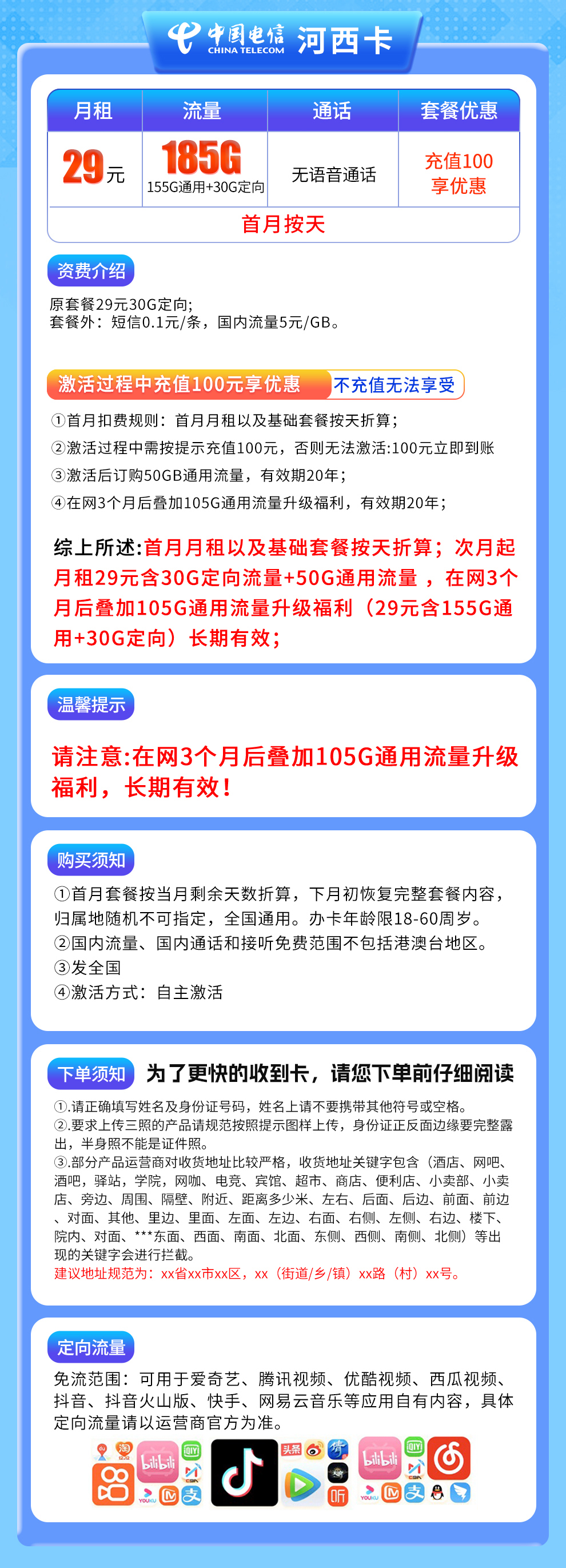 次月起月租29元含30G定向流量+50G通用流量,在网3个月后叠加105G通用流量升级福利(29元含155G通用+30G定向)长期有效 - 定向流量: