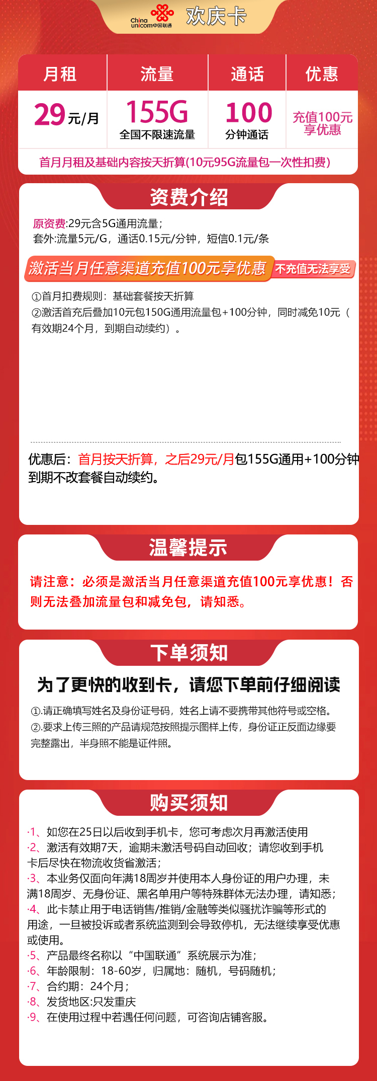 - 重庆专属,联通欢庆卡29元月租,含155G通用流量+100分钟通话。首月需充值100元才能享受优惠,之后每月29元,套餐有效期24个月,到期自动续约。