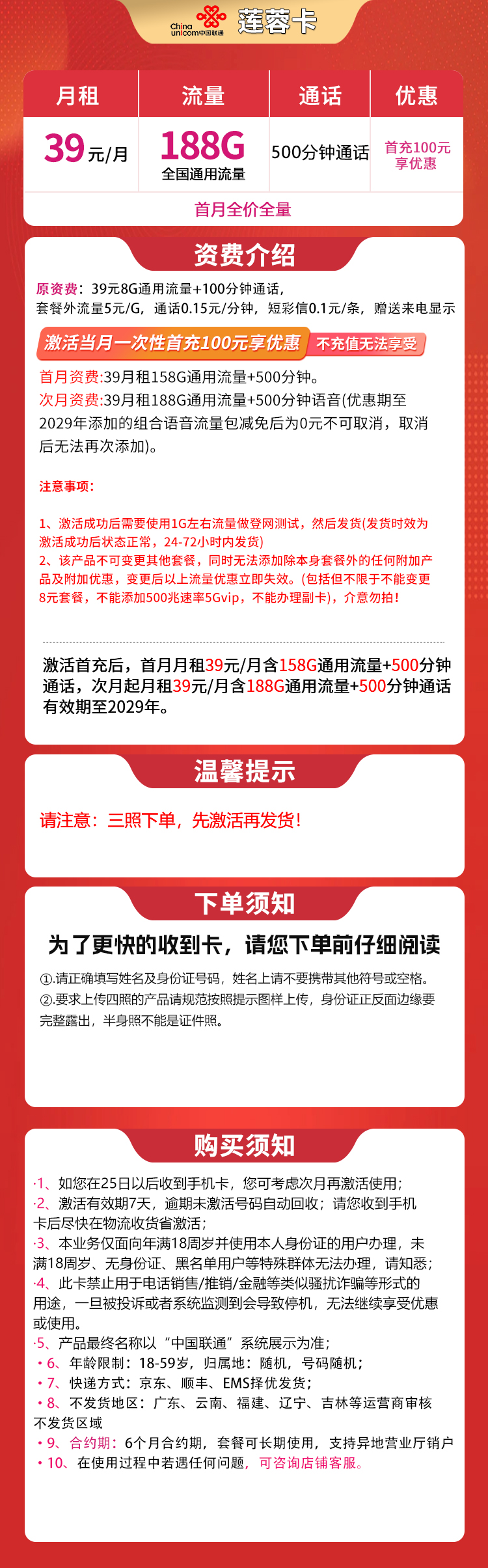次月资费:39月租188G通用流量+500分钟语音(优惠期至2029年添加的组合语音流量包减免后为0元不可取消,取消后无法再次添加)。注意事项: