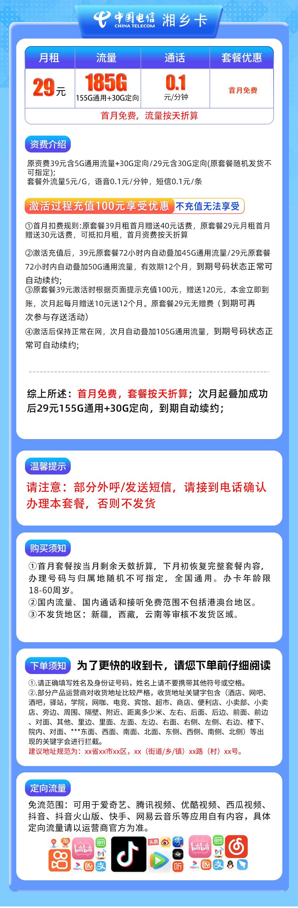 - 原资费39元含5GB国内通用流量+30G定向/29元含30G定向(原套餐随机发货不可指定) 套餐外流量5元/G,语音0.1元/分钟,短彩信0.1元/条;