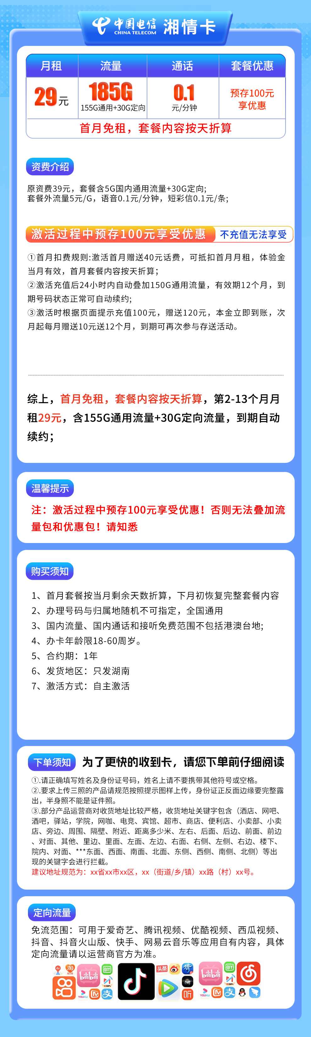 首月免租,套餐内容按天折算第2-13个月月租29元,含155G通用流量+30G定向流量,到期自动续约