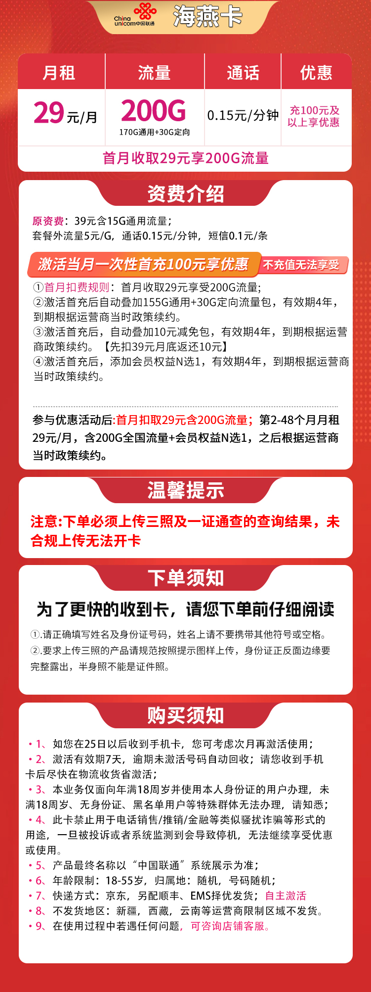 - 联通海燕卡:月租29元,含200G全国流量(155G通用+30G定向),另送4年视频会员(每月可自选)。需首充100元激活优惠,优惠期48个月,到期按运营商政策续约。首月即享29元月租。