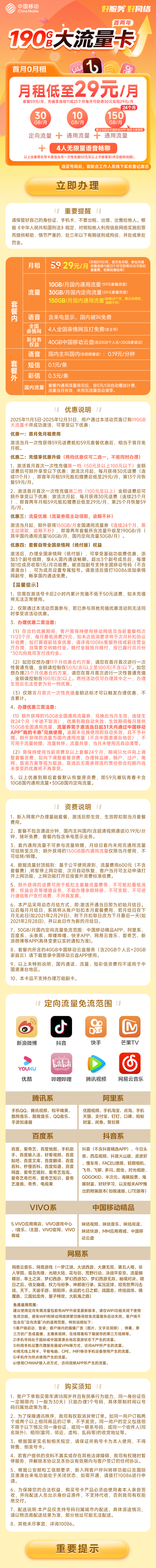 - 激活后30天内记得在移动APP领150G通用流量包(有效期24个月)