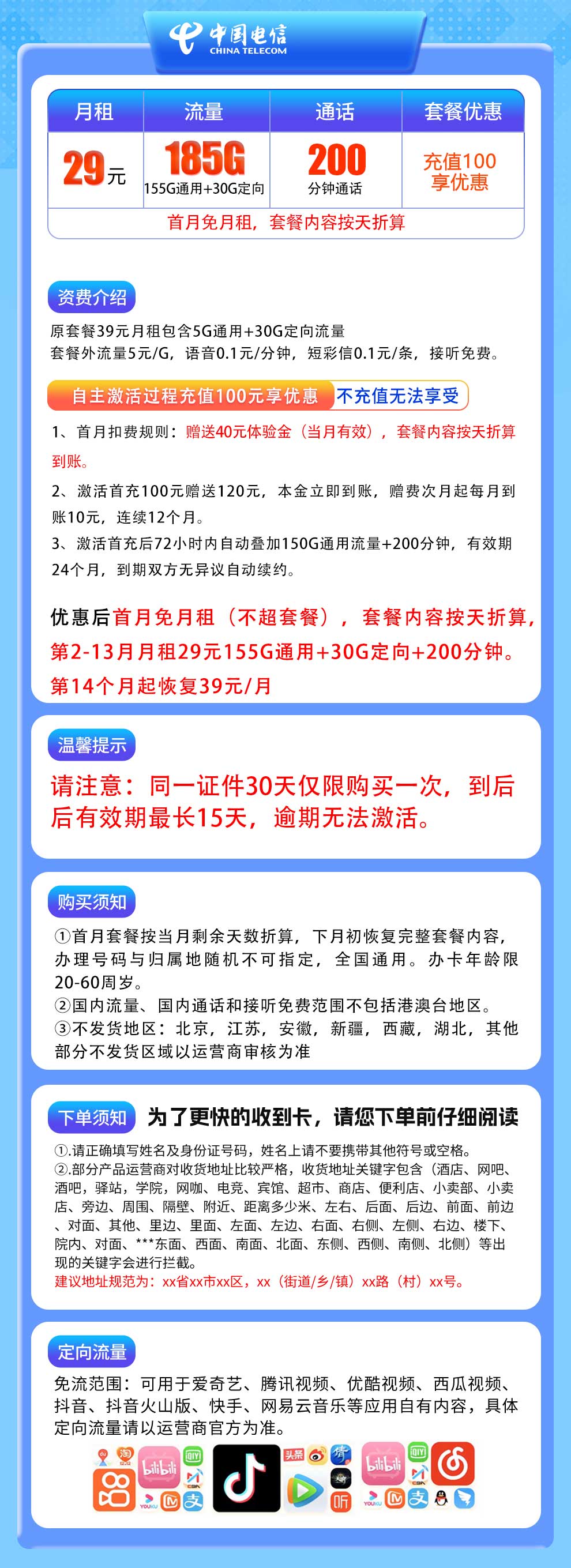 第2-13月月租29元155G通用+30G定向+200分钟:第14个月起恢复39元/月 - 定向流量:
