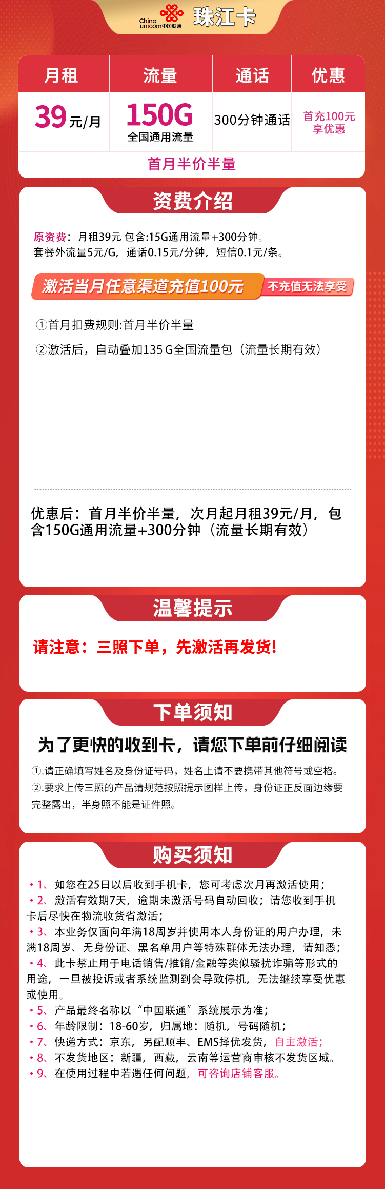 - 39元月租,150G通用流量+300分钟通话,全国可用。