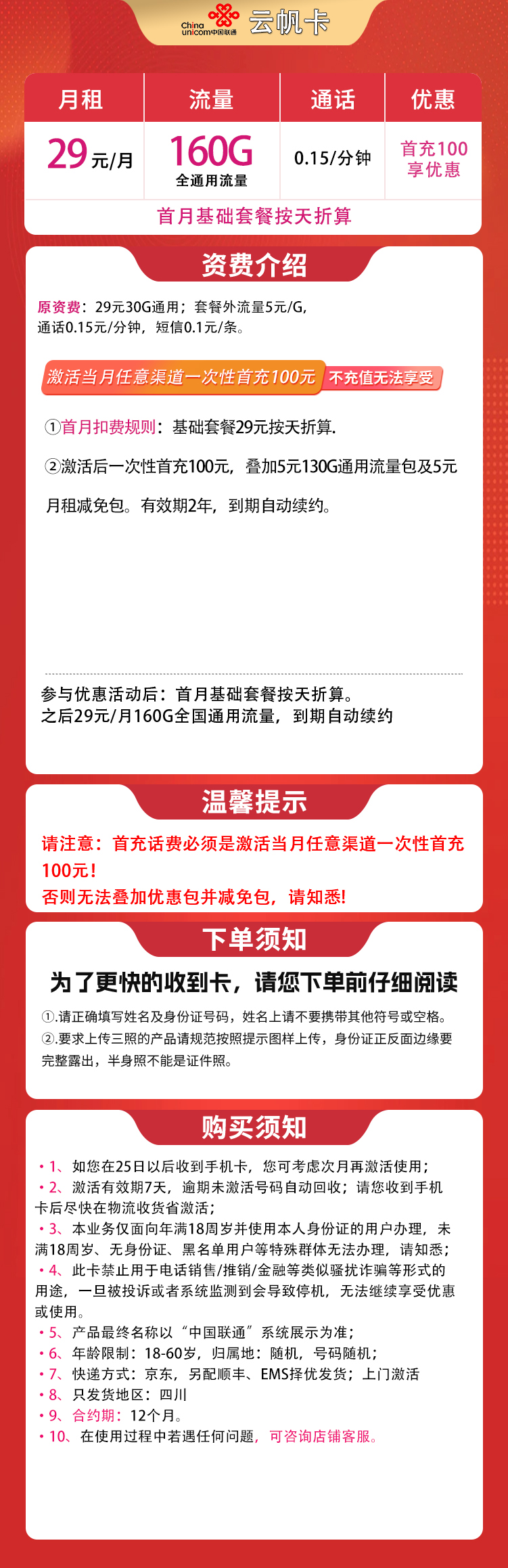 首月:激活后必须一次性充值100元才能享受优惠,首月29元套餐费按天折算