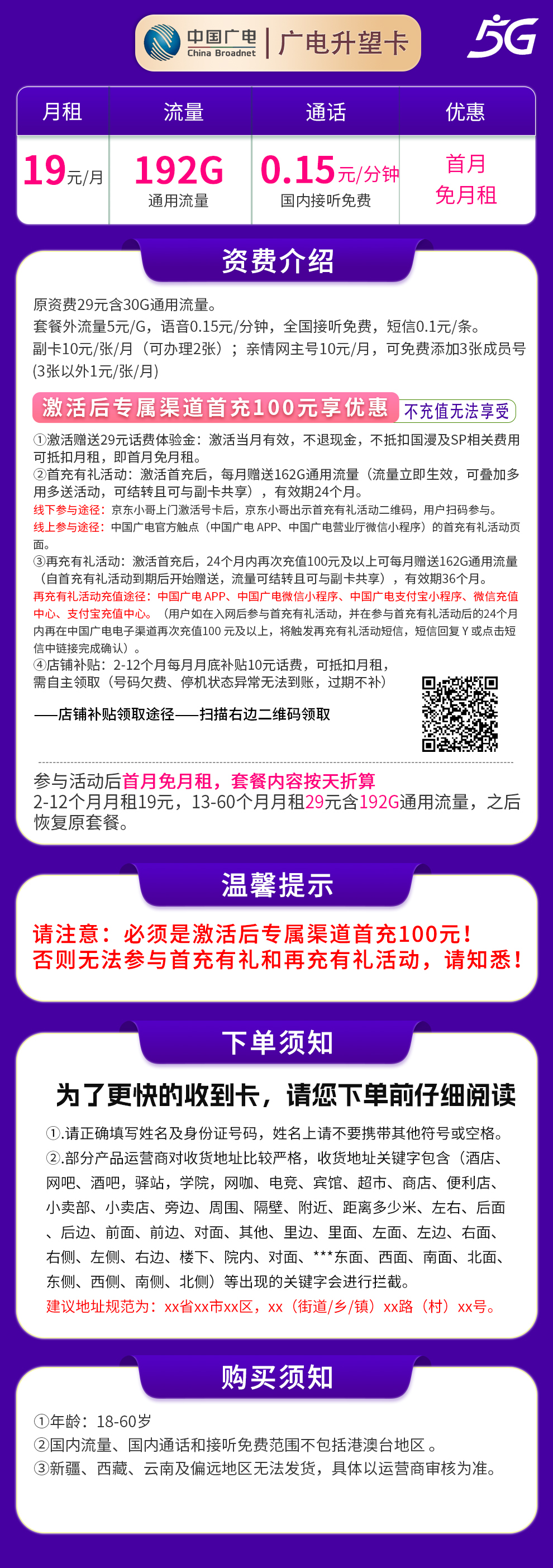 - 广电升望卡:首年19元月租,第二年29元月租,共含192G通用流量。