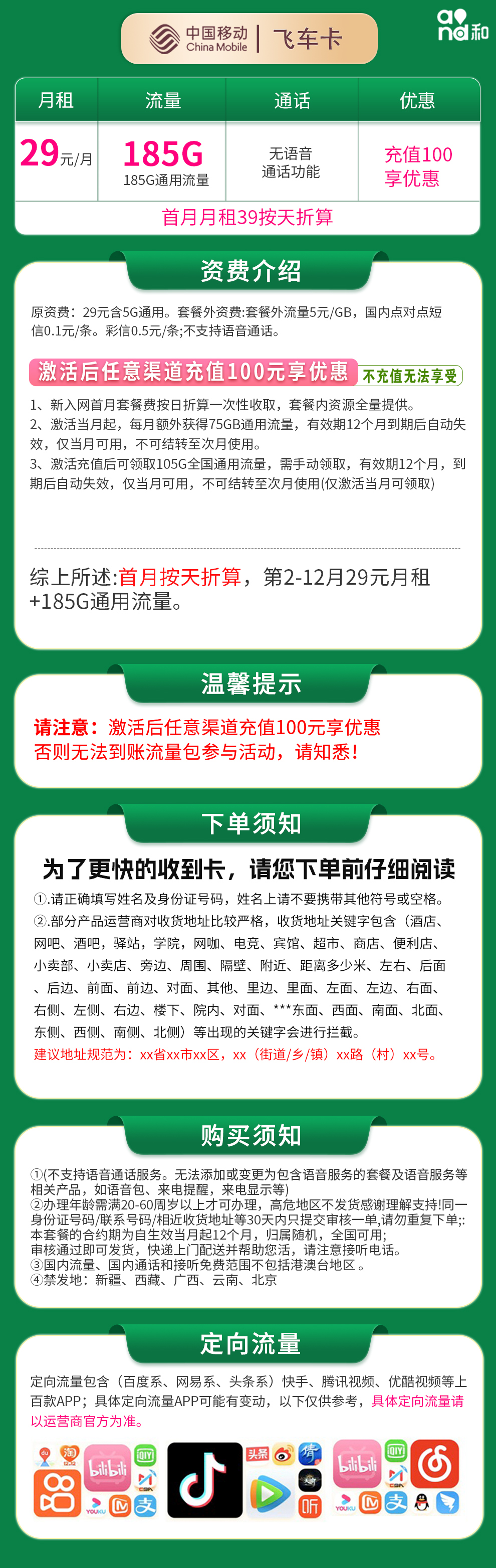 - 第2-12个月:月租29元,每月185G全国通用流量