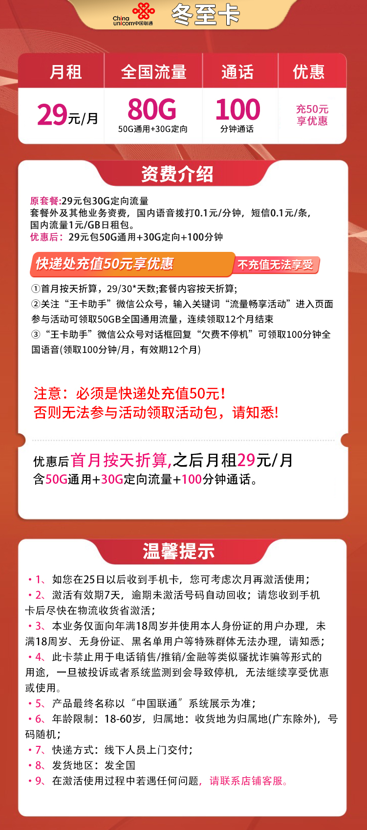 激活后快递处或专属链接充值50元,方可享受以下优惠: