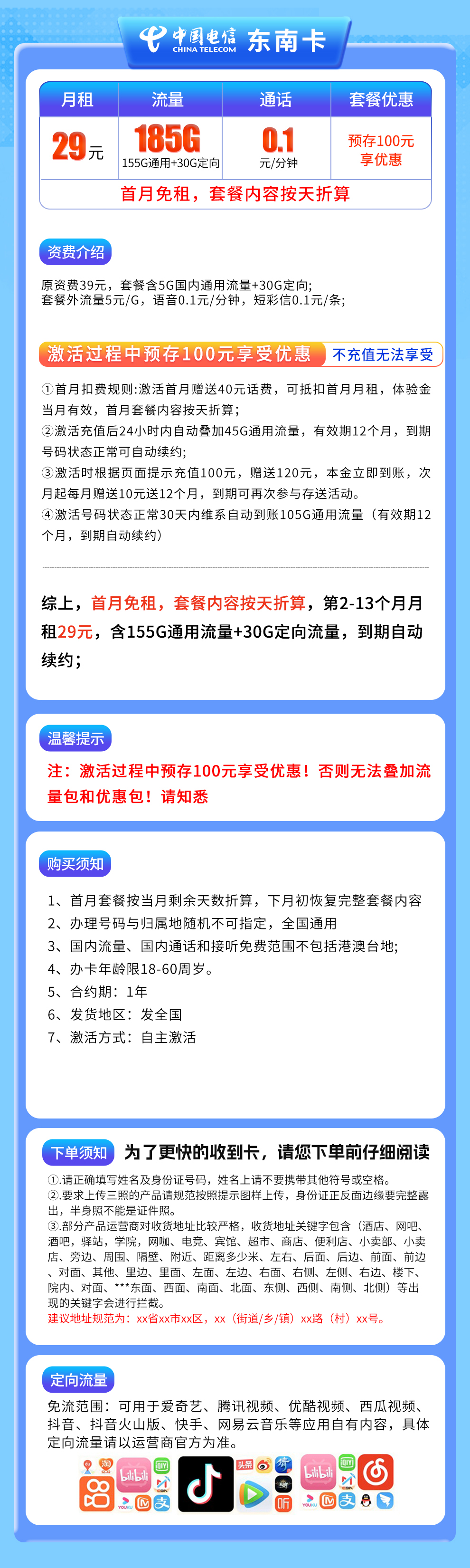 - 电信东南卡,29元月租,含185G流量(155G通用+30G定向),全国可用。
