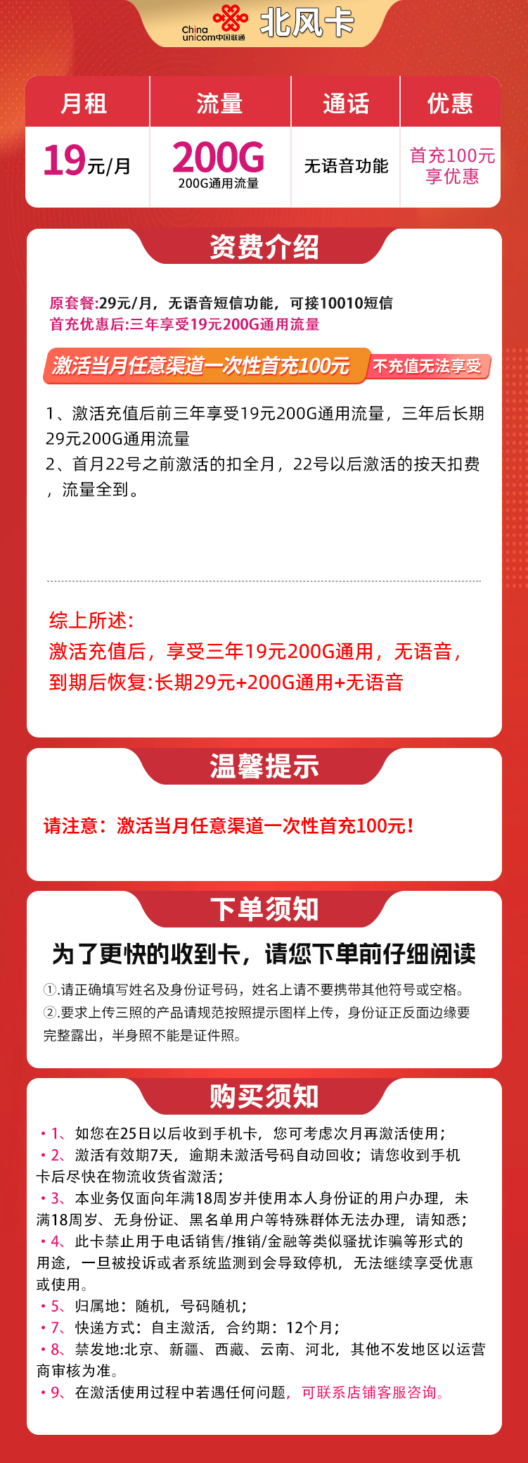 - 联通北风卡:首充100元后,前三年每月19元享200G通用流量(无通话短信),之后长期29元每月200G。激活当月22号前办扣全月,之后按天扣费。