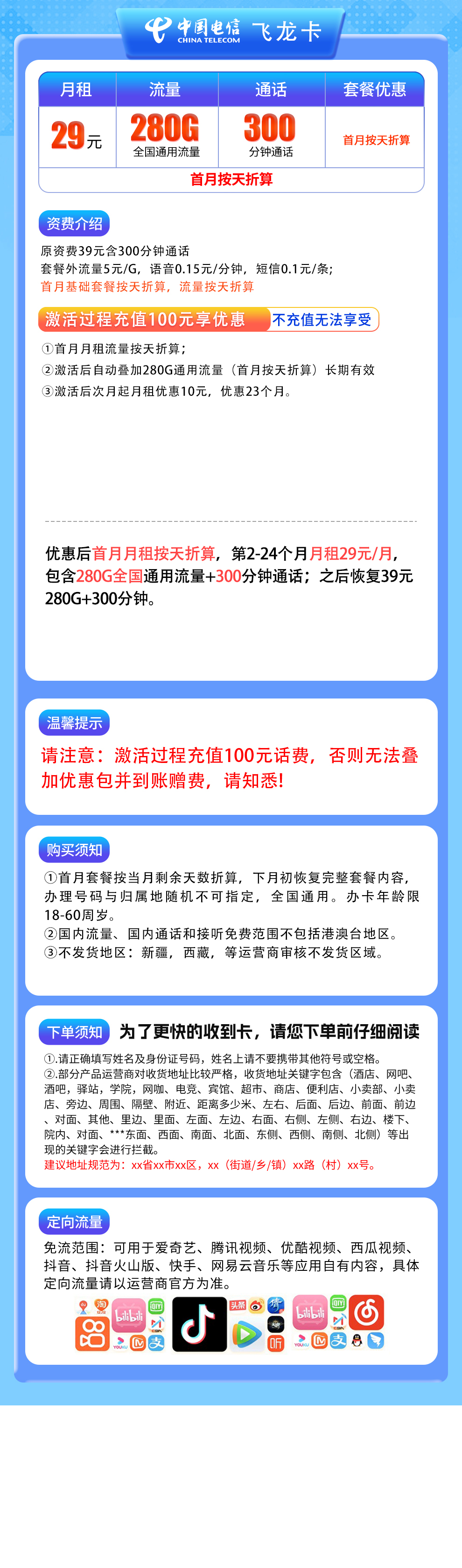 电信飞龙卡29元280G+300分钟【发全国】