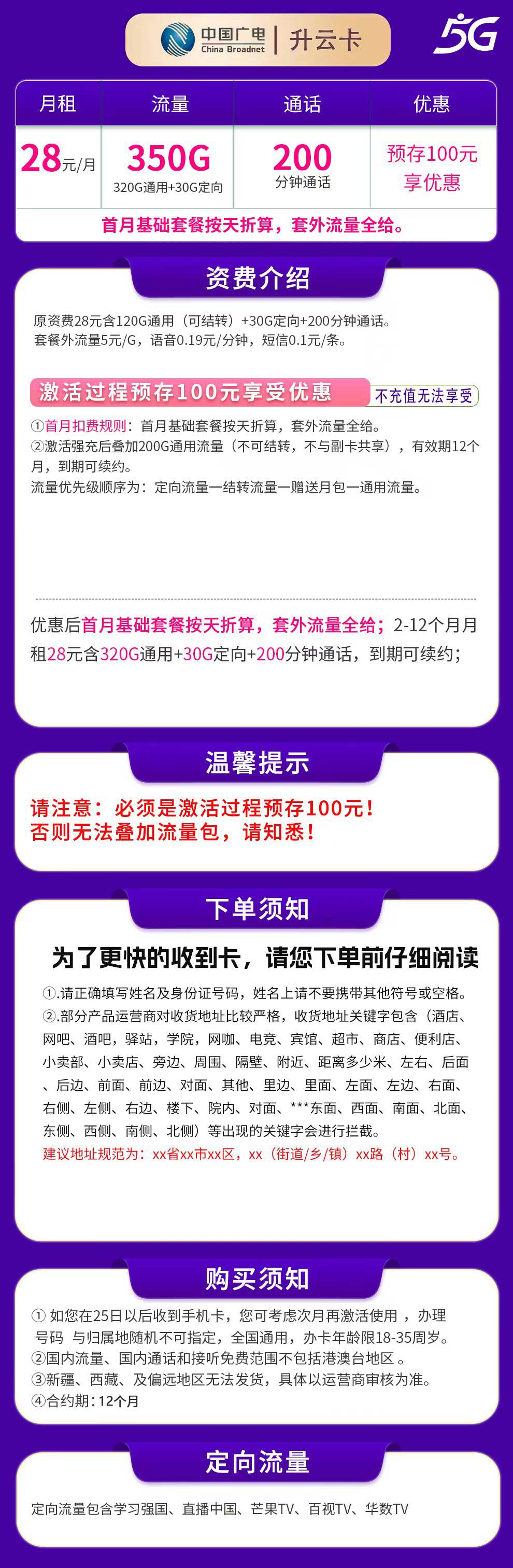 - 28元月租,每月350G流量(其中30G是定向流量)+200分钟通话。