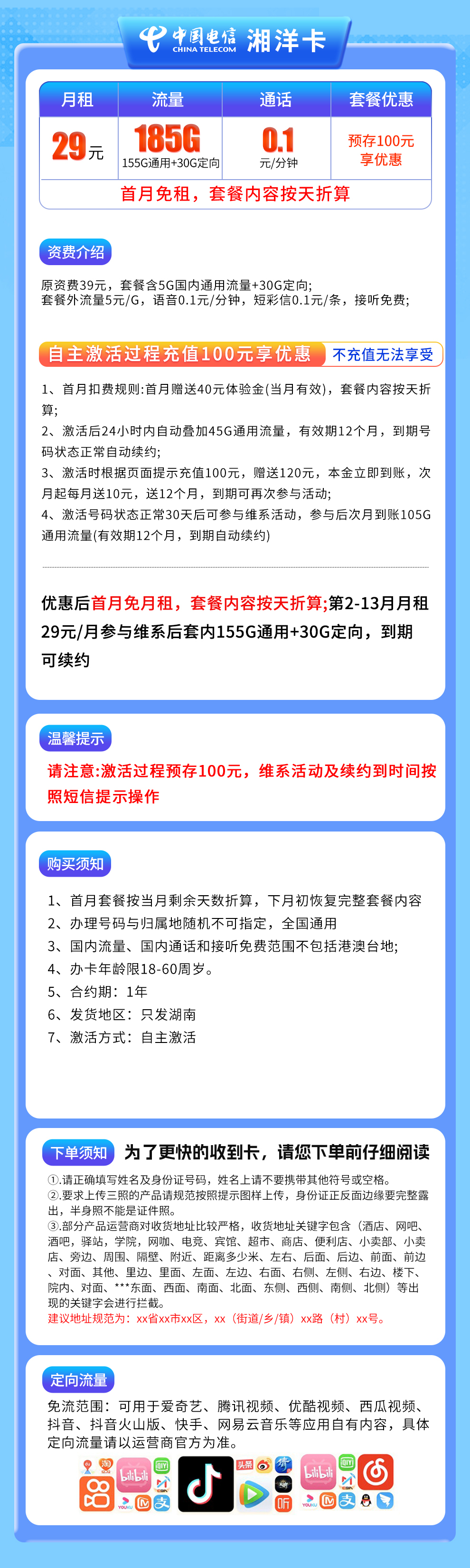 - 【湖南电信29元套餐】首月免租,第2-13个月每月29元,含185G流量(155G通用+30G定向),激活需充值100元参加优惠。
