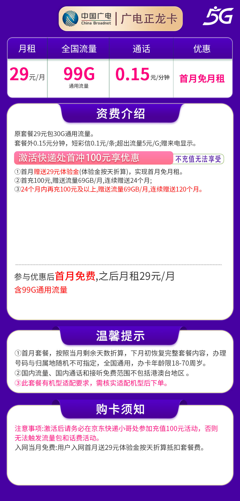 **一句话总结**:首充100,首月免费用。之后每月29元,享99G全国流量(含69G可结转、可共享的赠送流量),按要求再充一次100元,就能把优惠锁定10年。
