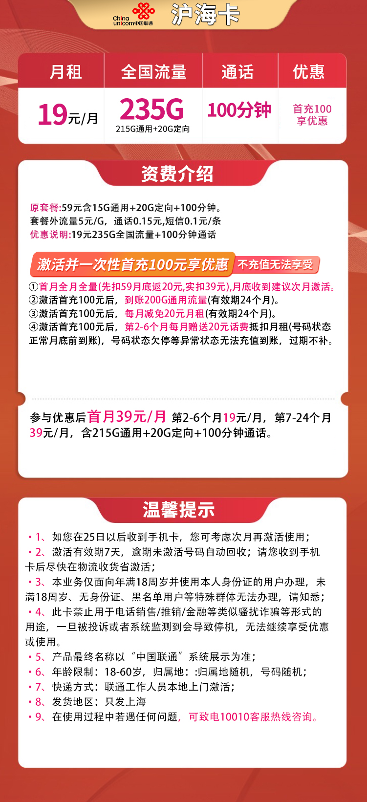 **一句话总结:** 适合上海用户,前半年每月19元用235G流量,半年后恢复39元,需要首充100元(会返还)。