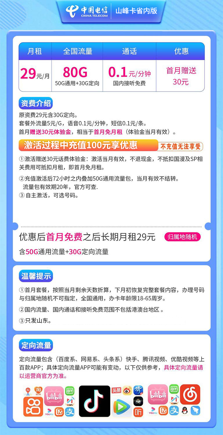 - 【电信山峰卡】29元月租,含80G流量(仅限山东地区办理)。