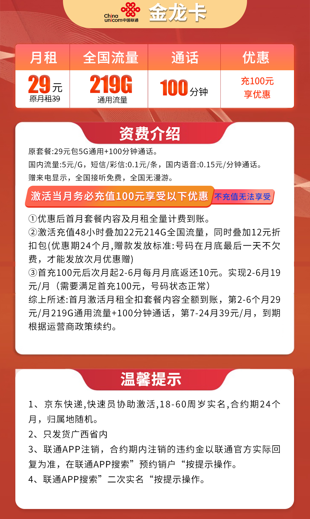 - 广西联通金龙卡,29元月租,包含219G通用流量和100分钟通话。