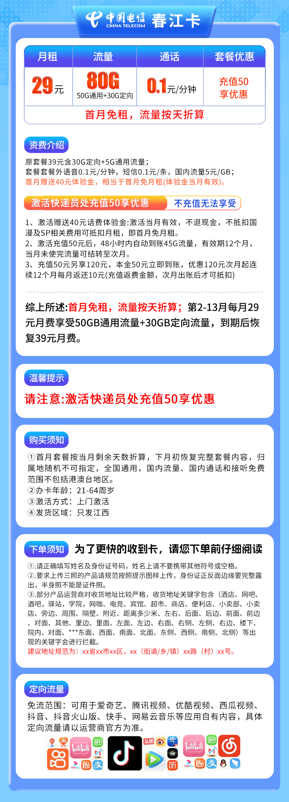 首月免费用,第2-13个月每月29元得80G流量(50G通用+30G定向),到期后变39元。