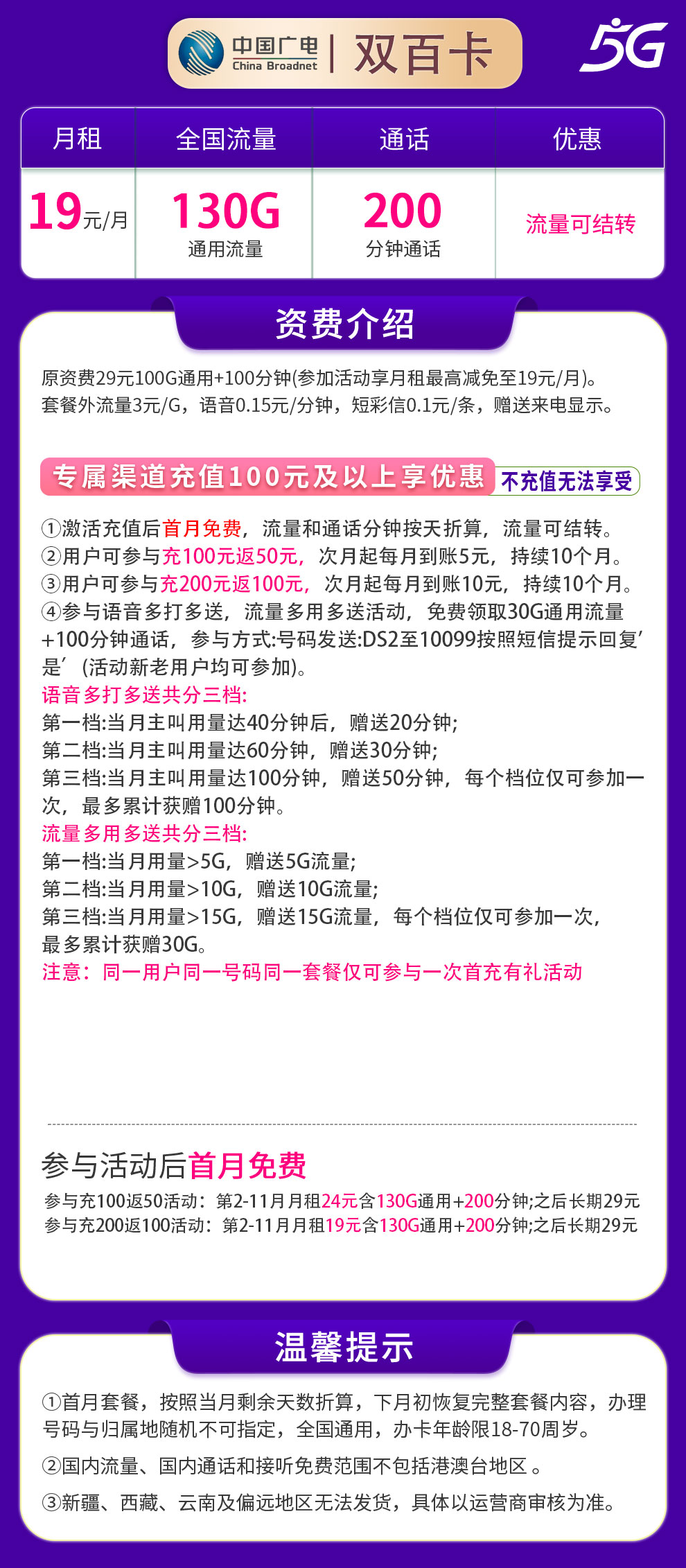 - 广电双百卡,月租19元,每月130G通用流量+200分钟通话,全国可用。套餐长期有效,到期可续。