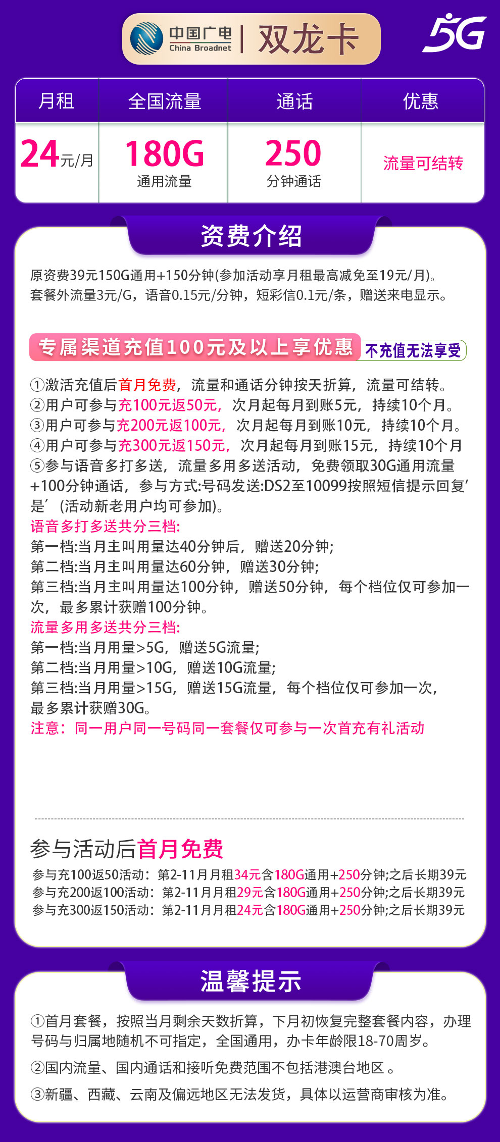 - G3广电双龙卡:月租24元,每月180G通用流量+250分钟通话(全国可用)。