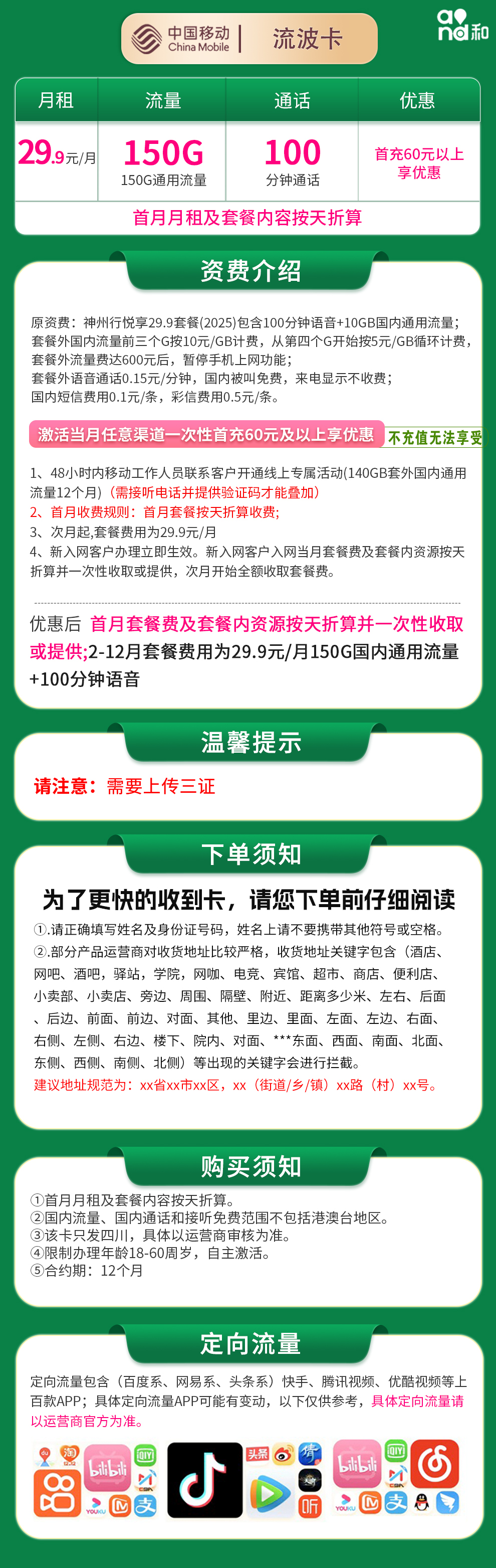 移动流波卡29.9元150G+100分钟【只发四川】