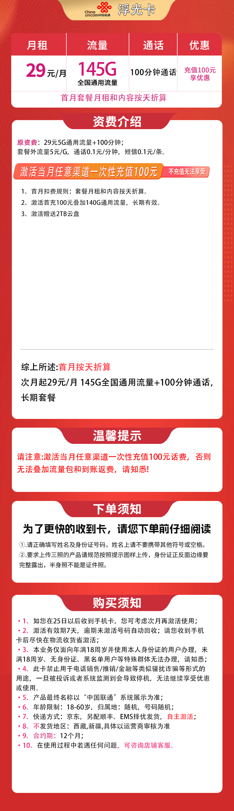 - 联通浮光卡:29元月租,含145G全国通用流量+100分钟通话,长期有效。激活首月需充值100元才能享受优惠,首月费用按天折算。