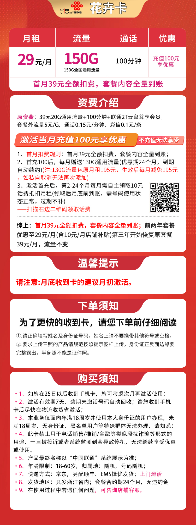 - 浙江联通花卉卡:首月39元,之后两年内每月29元得150G通用流量+100分钟通话,第三年起恢复39元月租。需首充100元激活优惠,次月起每月需手动领取10元话费抵扣。