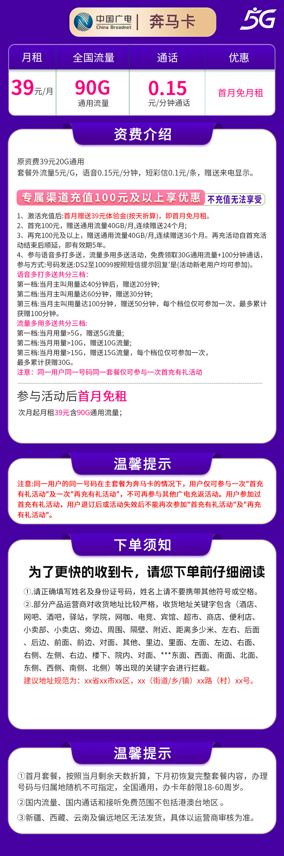 - 广电奔马卡39元套餐,首月免租,次月起月租39元含90G通用流量。需先充值100元激活,再充100元可享5年优惠。另有流量和通话多打多送活动,最高再得30G流量和100分钟通话。