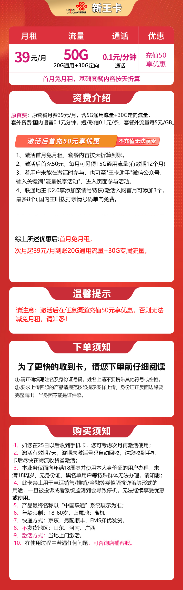 - 联通新王卡39元套餐:每月50G全国通用流量,适合需要大流量的用户。